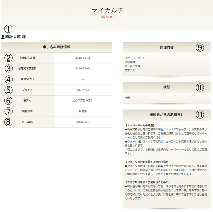 弊社で修理お申し込みをいただきますと、お客様専用の「マイページ」、さらにお申込み時計毎の「マイカルテ」をご利用いただくことができます。過去の修理履歴がすぐに確認でき、現在進行中の修理品の状況も一目でわかります。修理の状況を確認できることで、大切なお品物を安心してお預けいただくことができます。