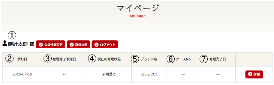 「マイページログイン」から⑦詳細をクリックしていただきますと、申込み時計毎の「マイカルテ」をご覧いただくことができます。